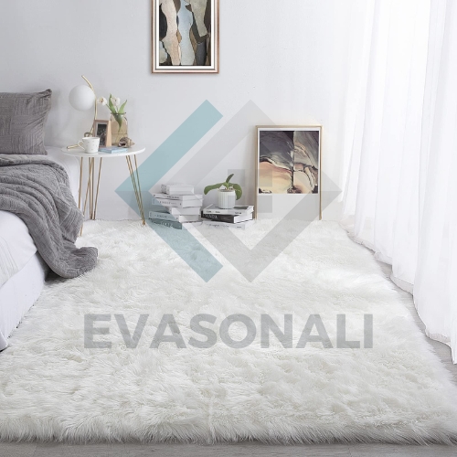 A white faux fur area rug that adds warmth and texture to your bedroom floor. Its soft material is perfect for stepping onto in the morning.