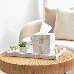 Decorative Coffee Table Tray – Faux Marble with Brass Handles
